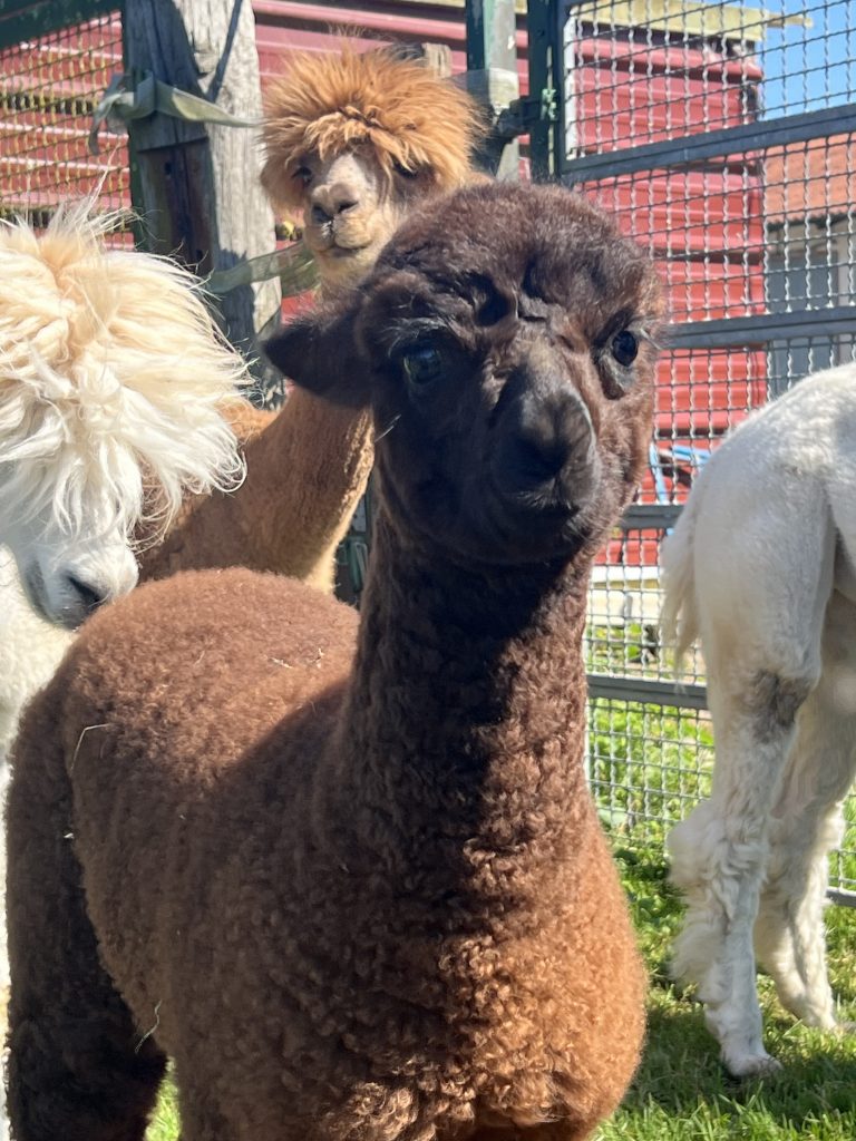 Holly ist eine unserer ersten Alpakastuten, sie ist unsere Leitstute und führt die ganze Mannschaft zuverlässig an. Da gab es dieses Jahr ein bisschen ein durcheinander da die Holly ihr erstes Fohlen bekommen hatte, der kleine Poco(lino)